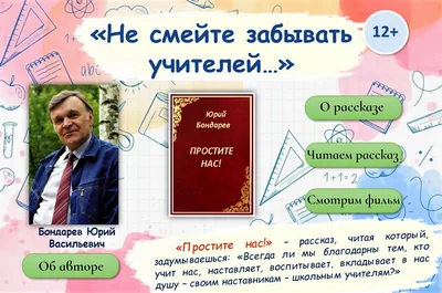Библиотека-филиал №19 в рамках республиканского онлайн-марафона «Признание», организованного Республиканской детско-юношеской библиотекой им. В. Х. Колумба, продолжает виртуальный обзор «Учитель на страницах книг» и предлагает познакомиться с замечательным произведением Юрия Бондарева «Простите нас».