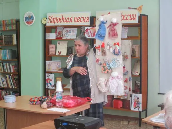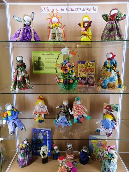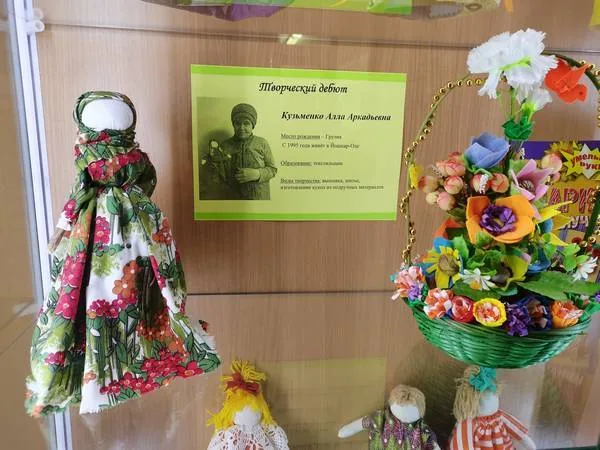 Затем слово предоставили Кокориной Г.А., наставнице нашего члена клуба А.А. Кузьменко, которую любезно пригласила её ученица, выставка которой оформлена в фойе Центральной библиотеки «Таланты города – творческий дебют Аллы Аркадьевны Кузьменко». Виды творчества А. А. Кузьменко: вышивка, шитьё, изготовление кукол из подручных материалов.