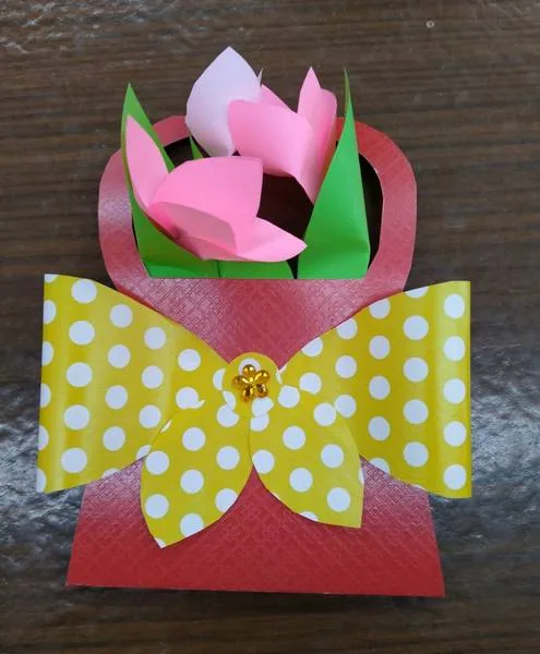 Для создания поделки ребята использовали цветной картон, двухстороннюю, офисную цветную бумагу, клей, ножницы и карандаш. Трудились с настроением, аккуратно, старательно. В результате получились оригинальные, яркие и красивые открытки, которые порадуют любимых мам и бабушек.