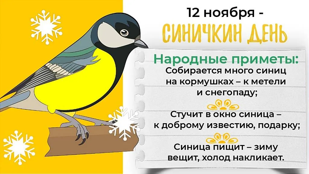 Экологический праздник – Синичкин день – появился в России несколько лет тому назад. Он создан по инициативе Союза охраны птиц России и отмечается 12 ноября. Но история праздника уходит в глубокую древность. Тогда наши предки отмечали день Святого Зиновия Синичника – покровителя лесных птиц, охотников и рыболовов. По народным приметам, именно к этому времени синицы, предчувствуя скорые холода, перелетали из лесов ближе к человеческому жилью и ждали помощи от людей.