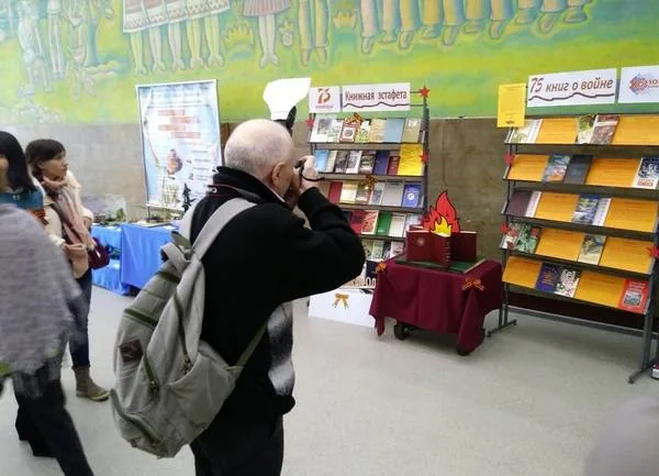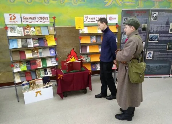 Украшением выставки стали георгиевские ленты, звёзды, тематические стихотворения, справка об участниках ВОВ, призванных с Марий Эл.Дополнила экспозицию книжная инсталляция «Вечный огонь», которая вызвала большой интерес и желание сфотографироваться на ее фоне.