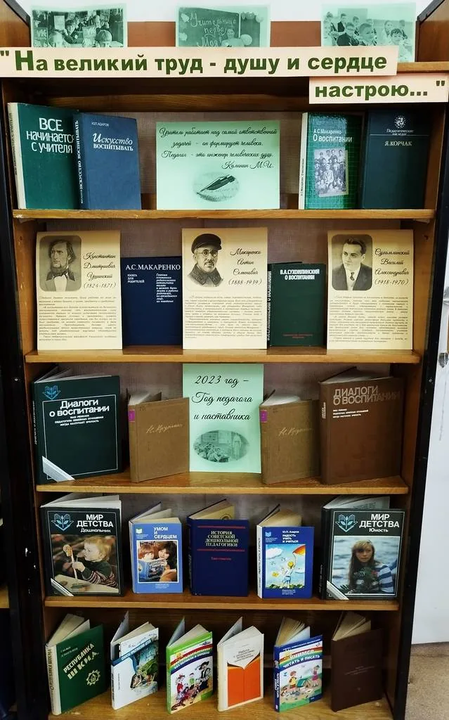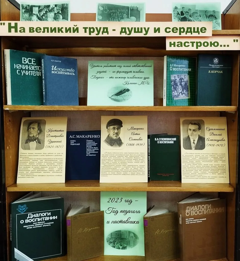 На выставке представлены книги выдающихся педагогов России, информация об Ушинском К.Д. - основоположнике русской педагогики, писателе, написавшем книги по образованию «Родное слово», «Детский мир» (в 2023 году исполняется 200 лет со дня рождения Ушинского К.Д.), о Макаренко А.С., написавшем известное произведение «Педагогическая поэма», «Лекции о воспитании детей», Сухомлинском В.А., авторе трудов «Сердце отдаю детям», «100 советов учителю», также книги о педагогике и воспитании современных новаторов и педагогов.