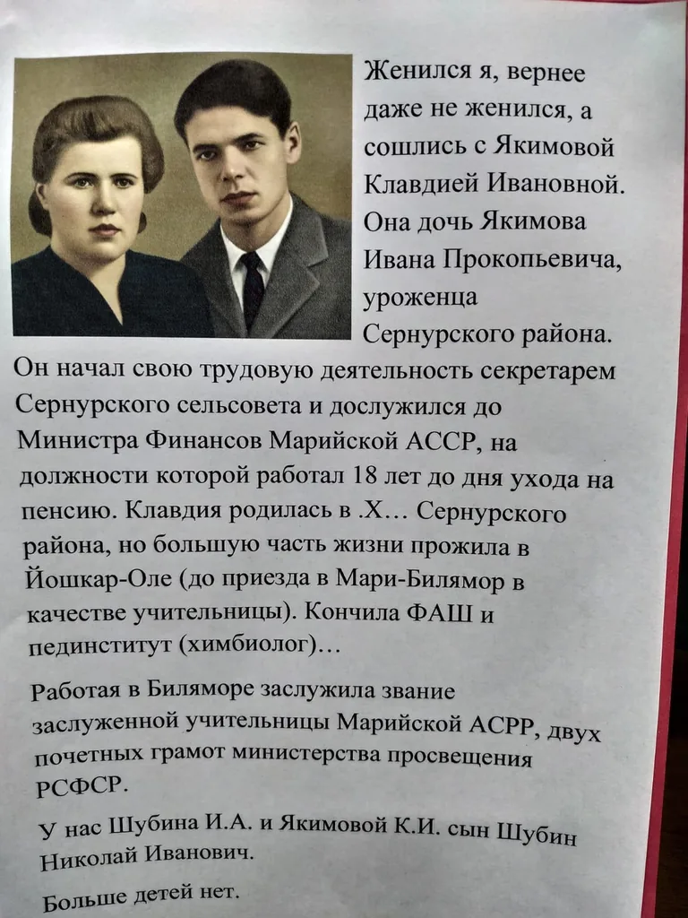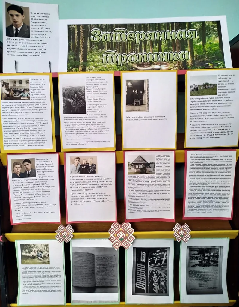 В рамках празднования Дня рождения Республики Марий Эл в библиотеке-филиале №29 открылась выставка-автобиография "Затерянная тропинка". На выставке представлены фотоматериалы, рукописи, тетрадь с автобиографией Ивана Андреяновича Шубина. Шубин Иван Андреянович (1927-1984) автор повести "Йомшо йолгорно" ("Затерянная тропинка") родился в Мари-Турекском районе в селе Мари-Билямор. Иван Андреянович известен одной повестью, которая была напечатана в журнале "Ончыко" в 2000 году в №11-12. Кроме этой повести у Ивана остались и другие рукописи, которые хранятся в школьном музее села Мари-Билямор руководителем, которой является Любовь Назаровна Чернова.