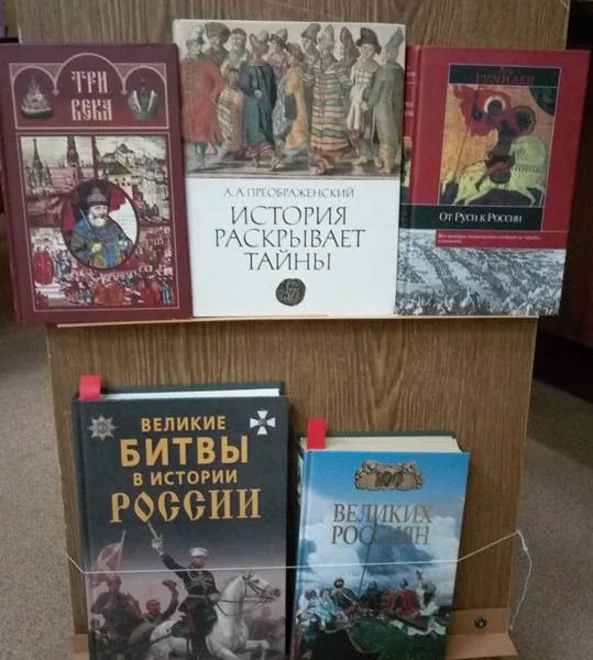 Развернутая для читателей выставка - дата включает в себя 7 книг: очерки этнической истории Гумилева Л. Н. «От Руси до России», сборник рассказов Преображенского А. А. «История раскрывает тайны»(12+), издание «Князья Пожарские и Нижегородское ополчение: род князей Пожарских от Рюрика до наших дней» (авт.-сост. Протоиерей А. Соколов), Iтом исторического сборника «Три века: Россия от Смуты до нашего времени», сборники «Великие битвы России» и «100 великих россиян», школьный словарик «Праздники России». Экспозиция дополнена стихотворением Натальи Майданник. Выставка располагается в читальном зале и будет экспонироваться до 15 ноября.