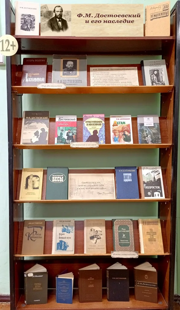 В 2026 году исполняется 205 лет со дня рождения великого русского писателя, публициста и философа Федора Михайловича Достоевского. Десятки произведений, созданных Достоевским, вошли в золотой фонд русской классической литературы. К этой важной дате в библиотеке - филиале №4 оформлена выставка - дата «Ф.М. Достоевский и его наследие», которая содержит три раздела: «Мир Достоевского», «Достоевский и его герои», «В тени гениальности».