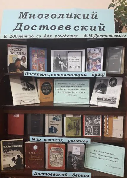 В связи с этим знаменательным событием в библиотеке-филиале №19 оформили выставку-дату «Многоликий Достоевский», на которой представлены издания о жизни и творчестве великого писателя, воспоминания современников, а также его бессмертные произведения. Вниманию читателей представлены книги из фонда библиотеки: «Преступление и наказание», «Идиот», «Бесы», «Игрок», «Белые ночи» и другие.