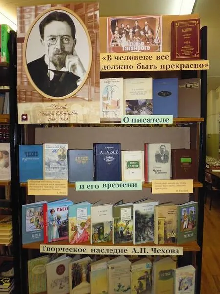В разделе «О писателе и его времени» представлены книги о жизни и творчестве Чехова, принадлежащие авторам Чудакову А. П., Чехову М. П., Полоцкой Э, Семанову М. Л., Шубину Б. М., Бердникову Г. П., и др., которые открывают новые неожиданные грани его жизненной и писательской судьбы. Книга Кулешова В. И. «Жизнь и творчество писателя» знакомит с жизнью и творчеством выдающегося русского писателя А. П. Чехова. В ней прослежены особенности прозы и драматургии писателя, идейно–художественное своеобразие его творчества, специфика чеховской поэтики, развитие принципов реализма, поиск пути писателя в литературе. А. П. Чехов был не только замечательным писателем, но и высокообразованным, передовым врачом. Книга Шубина Б. М. "Доктор А. П. Чехов" знакомит читателя с его медицинской деятельностью, с кругом его научных и общественных интересов. Вниманию читателей предлагаются издания произведений, сборники рассказов, повестей и пьес в разделе «Творческое наследие А. П. Чехова». Выставка дополнена высказываниям К. Федина: «Широкая известность Чехова среди всех народов мира наполняет нас отрадой и гордостью за русскую литературу, за нашего Чехова» и др.