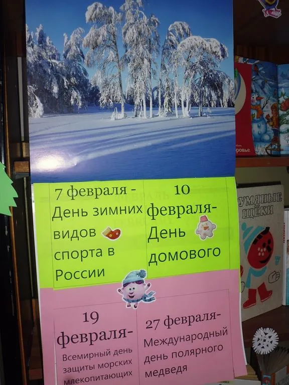 Выставка «Круглый год» предлагает познакомиться с такими интересными датами месяца, как День зимних видов спорта, День домового. А также Всемирным днем защиты морских млекопитающих, Международным днем полярного медведя. Выставка представляет книги и периодические издания, дополняют экспозицию игрушки, наклейки, поделки из бумаги.