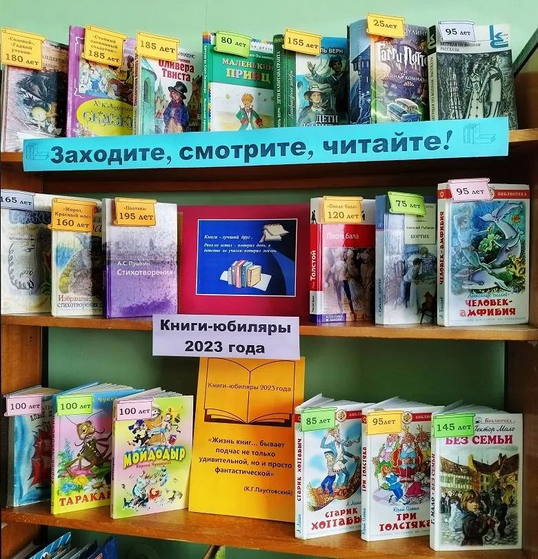 В библиотеке-филиале №1 в детском отделе подготовлена выставка- демонстрация «Заходите, смотрите, читайте!». Библиотекари провели с юными читателями обзор книг-юбиляров 2023 года.