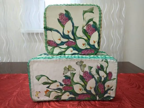 На выставке представлены плетеные изделия из бумажных трубочек : корзинки и шкатулки различных форм и размеров, украшенные цветами в технике «Декупаж» (техника декорирования различных предметов, основанная на присоединении рисунка, картины или орнамента (обычно вырезанного) к предмету и далее покрытии полученной композиции лаком ради сохранности, долговечности и особенного визуального эффекта.