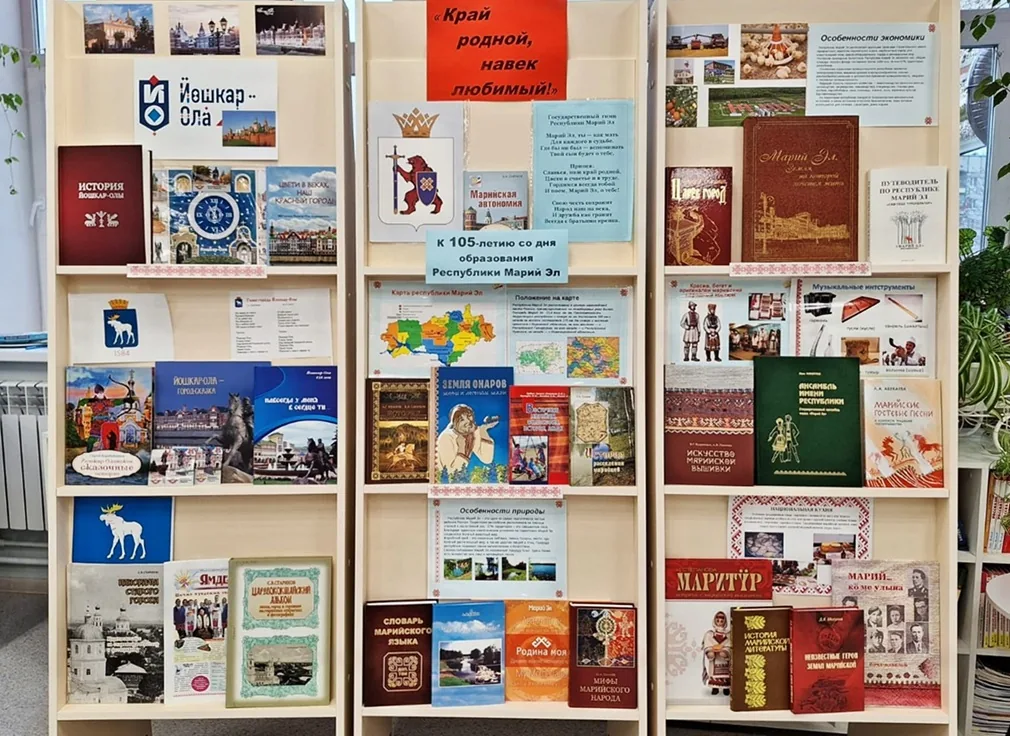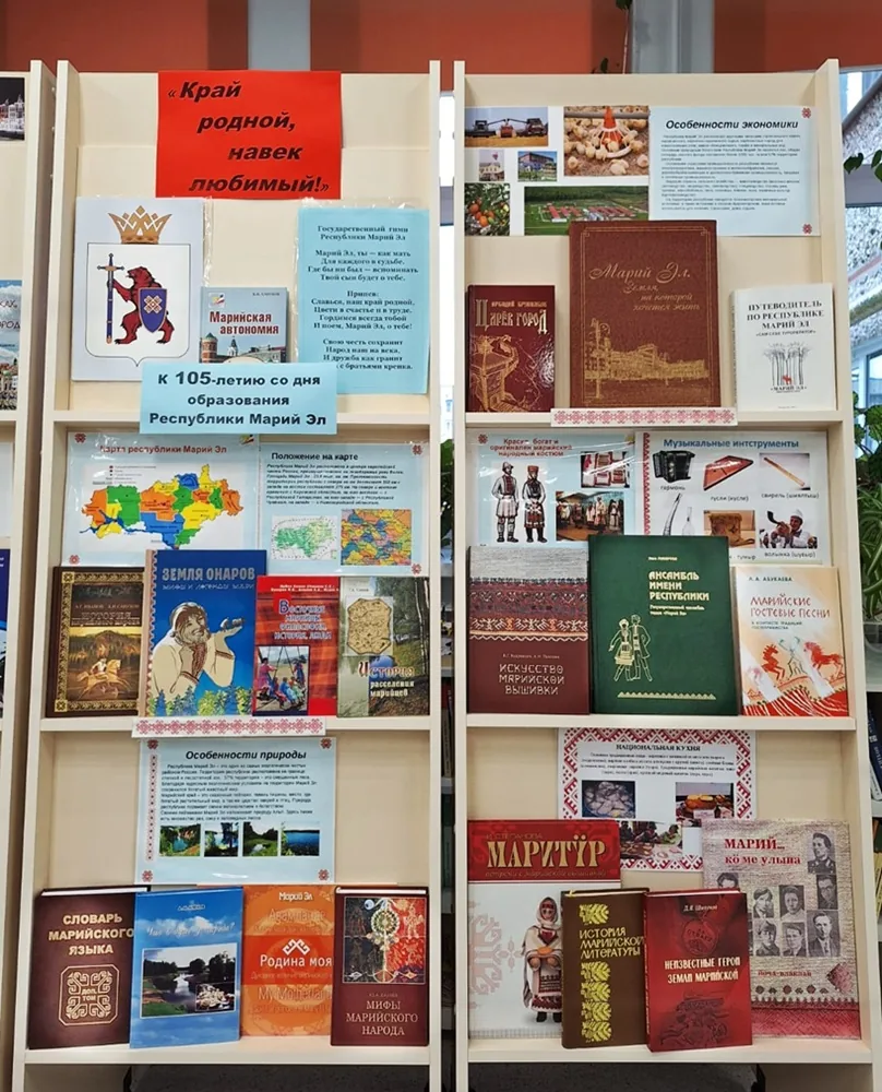 В модельной библиотеке-филиале №1 оформлена тематическая выставка-панорама «Край родной, навек любимый!». 04 ноября 2025 года Республика Марий Эл празднует 105-лет со дня образования.