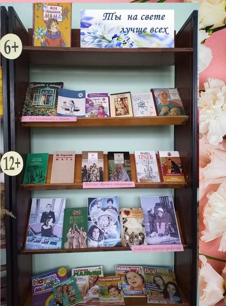 8марта - праздник весны, женской красоты и семейных ценностей. В канун этого праздника в библиотеке-филиале №4 оформлена выставка-праздник «Ты на свете лучше всех», которая посвящена женщине, вечной загадке, которую пытались и пытаются разгадать во все времена. На полке для юных читателей собраны книги со стихами , рассказами, песнями о любви, об уважении к маме. Например: В. Драгунского, Э Успенского, А. Барто и других авторов. Образ женщины-матери, защищающей и оберегающей своих детей от всяческих бед широко используется и в современной и классической литературе. Для читателей среднего и старшего возраста подобрана литература авторов: М. Горький «Мать», В. Закруткин «Матерь человеческая», Н. Некрасов «Кому на Руси жить хорошо», В. Распутин «Уроки французского», М.Трауб «Когда мама – это ты» и др. Полка «Необычные женские профессии» - о кумирах и эпатажных женщинах в истории.