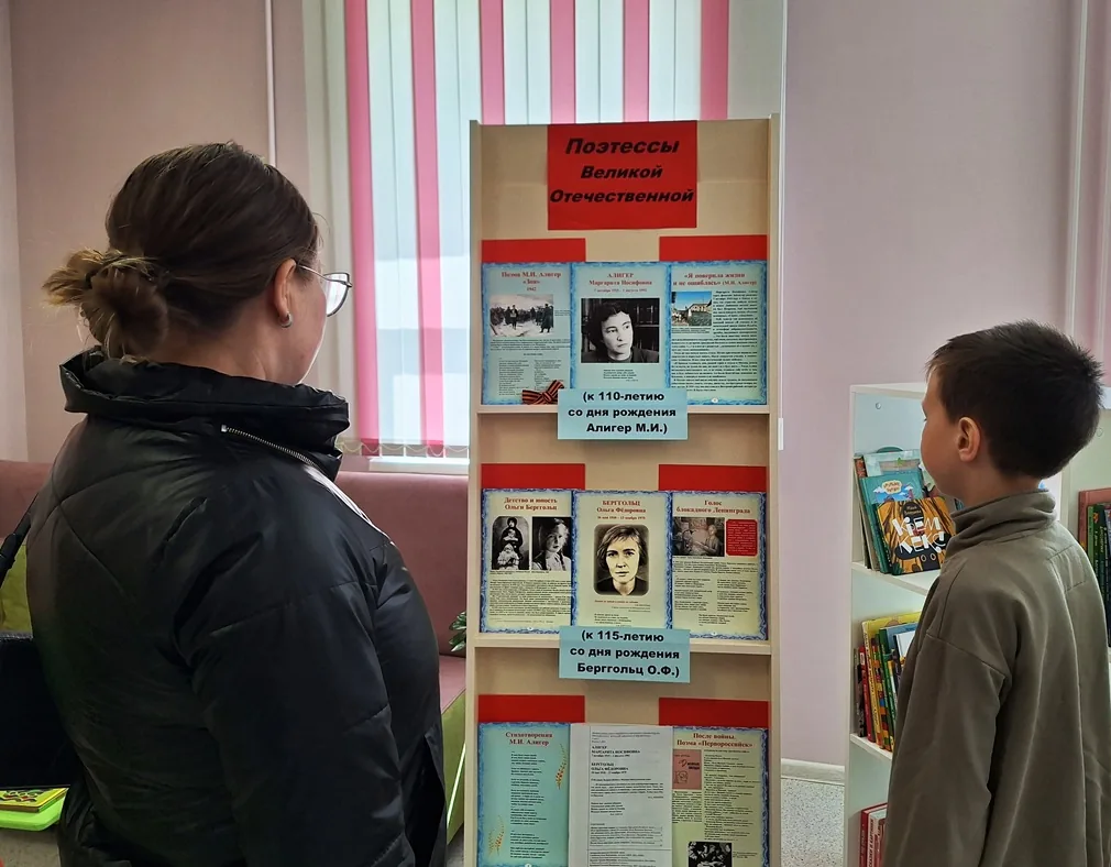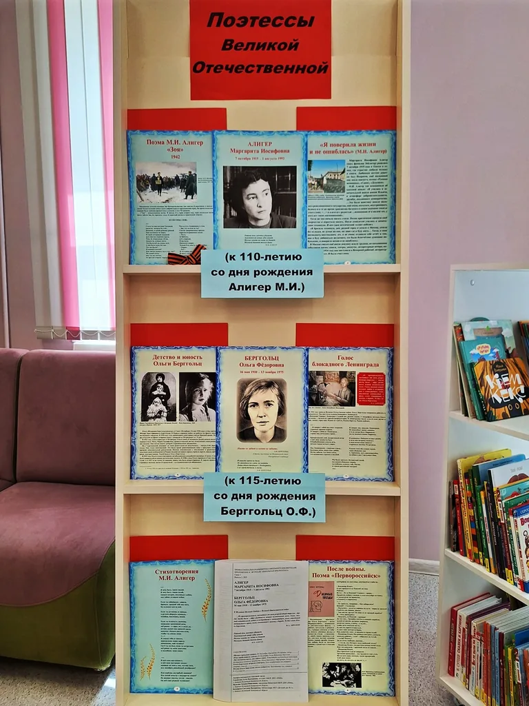 В модельной библиотеке-филиале №1 подготовлена выставка-приглашение «Поэтессы Великой Отечественной», посвященная 115-летию со дня рождения Ольги Федоровны Берггольц –поэтессы, прозаика, драматурга, журналиста, члена союза писателей и 110-летию со дня рождения Маргариты Иосифовны Алигер – поэтессы, переводчицы, журналистки, военного корреспондента.