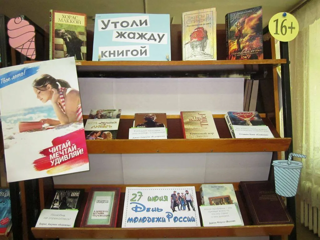 Выставка-призыв «Утоли жажду книгой!» предлагает молодежной аудитории подборку популярных книг современных авторов и классиков из рейтинга «100 самых популярных книг среди молодежи». Данный рейтинг составлен на основе опроса молодых людей и отражает их литературные вкусы.