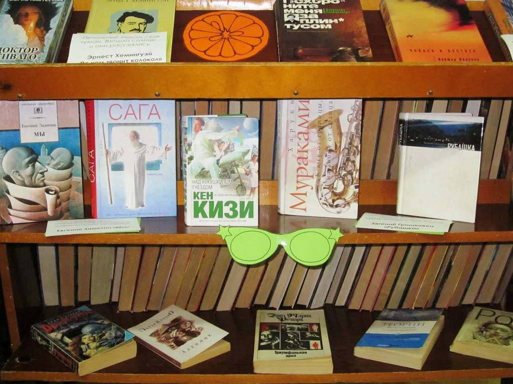 На полках можно найти произведения С. Кинга, П. Санаева, К. Кизи, В. Пелевина, Е. Замятина, Б. Акунина и др. авторов, получивших мировую известность. Помимо «модных» писательских имен, привлекают внимание к книгам и цитаты из произведений, заставляющие читателя остановиться и поразмышлять, например: «Наши проблемы – это прежде всего то, что мы сами о них думаем (Дж. Фаулз «Волхв»), «Не все ли равно, чем и как счастлив человек!» (И. Бунин «Темные аллеи»).