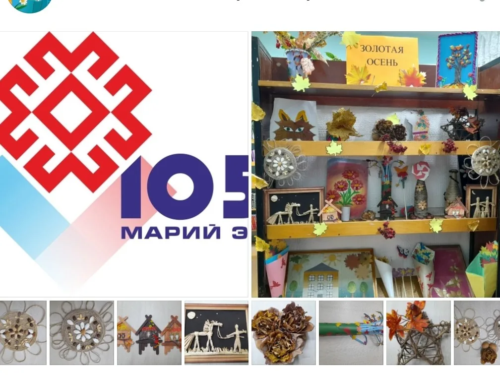 В рамках празднования 105- летия со Дня образования Республики Марий Эл 14 октября в библиотеке-филиале №29 открылась выставка творческих работ воспитанников детских клубов "Факел", "Радуга" и пользователей детского отдела под названием "Золотая осень". На выставке представлены поделки из разных природных материалов , таких, как, шишки, желуди, листья, сухоцветы, веточки, мох, овощи, фрукты, ягоды и др. В различных техниках выполнены лесные композиции, осенние сказки, игрушки, яркие букеты, домики, фигурки из бисера. Особое место на выставке занимает плетение в одну оригинальную композицию лекарственных трав, таких, как : полынь, зверобой, тысячелистник, ромашка. Они создают иллюзию осеннего гербария.. Благодаря этим растениям, выставка превращается в волшебную осеннюю сказку. Любуясь ослепительной красотой разных фигурок, посетители библиотеки смогут легко, радостно и незабываемо провести своё время в прекрасной, сказочной обстановке.