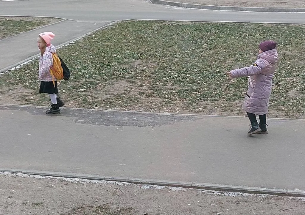 Идём погреть руки об батарею. По пути рассказывает, что мама разрешила погулять, и они с подружкой в фиолетовой шапке гуляют.