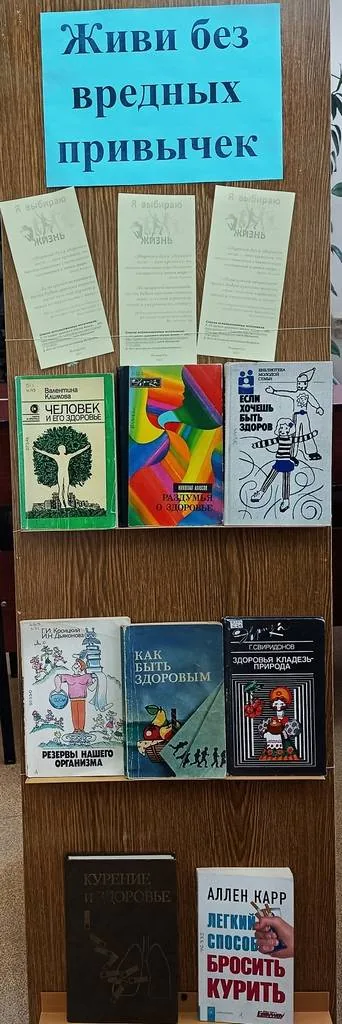 По вышеуказанной теме была подготовлена книжно- иллюстративная выставка, книги с которой помогут читателю понять, как лучше организовать свой труд, отдых, питание и объяснят, почему вредны увлечения курением и всякого рода излишеством.