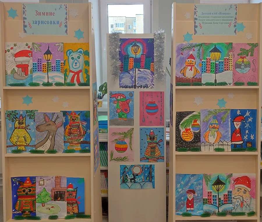 Выставка рисунков привлекает внимание яркостью, интересными сюжетами, детской непосредственностью. На своих рисунках дети изобразили ночной город в свете фонаря и северного олененка, милого мишку и совушек ярких окрасок, елочные игрушки и дедов Морозов. В каждой картине читается волшебство и предвкушение новогоднего чуда.